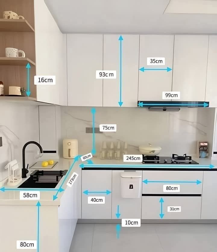 → Cân nhắc: Thiết kế tủ dựa trên chiều cao trung bình người dùng và ưu tiên tủ trên có giá nâng hạ để dễ sử dụng.