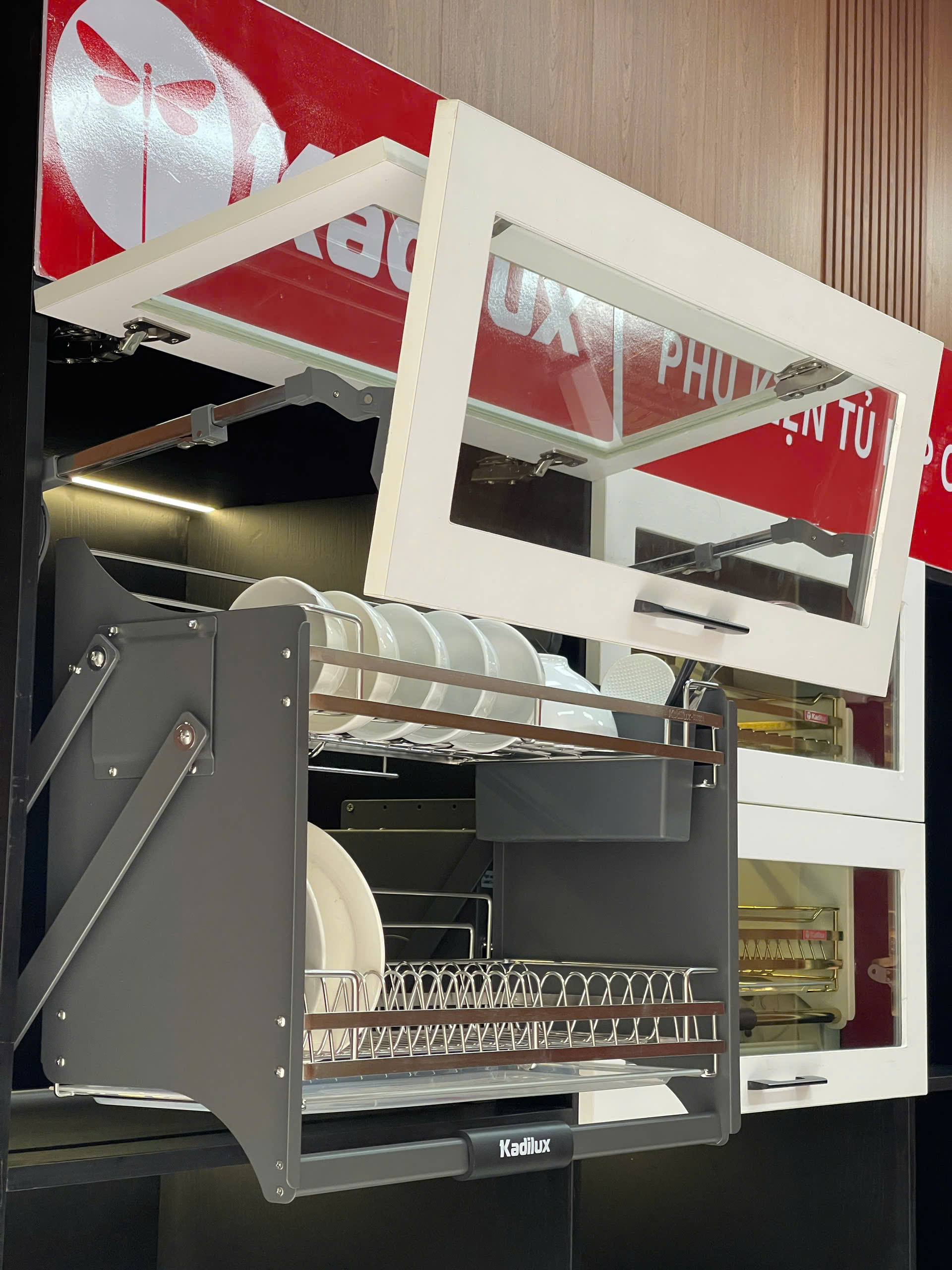 Giá bát nâng hạ Kadilux: dễ thao tác, tiện lợi cho người thấp.